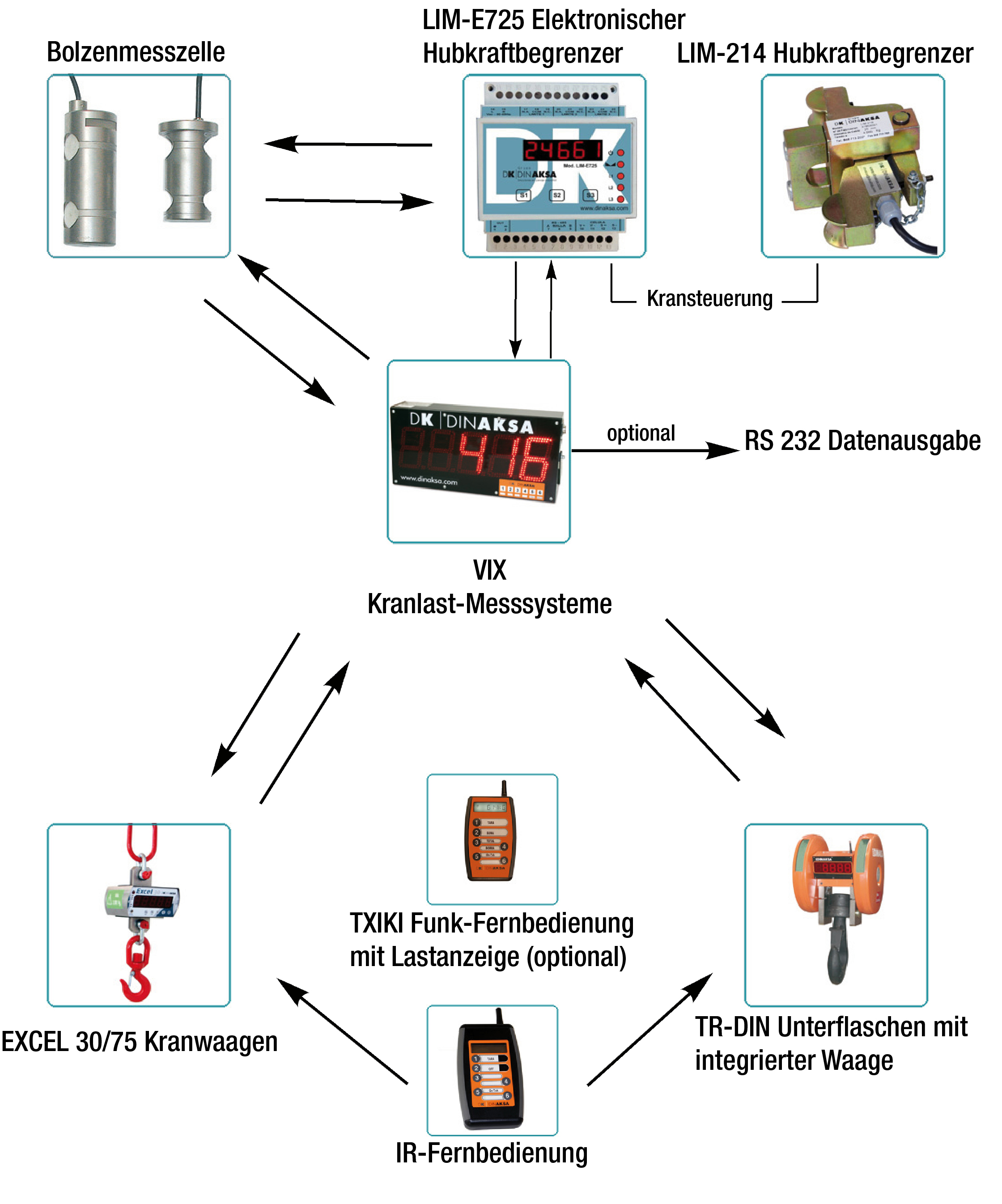 Einfache Bedienbarkeit und hohe Nutzungsdauer sind nur zwei Vorteile der KranlastMesssysteme von DINAKSA. Nachfolgend wird das DINAKSA System veranschaulicht, auf den folgenden Seiten finden Sie detaillierte Produktinformationen der individuellen Komponenten.